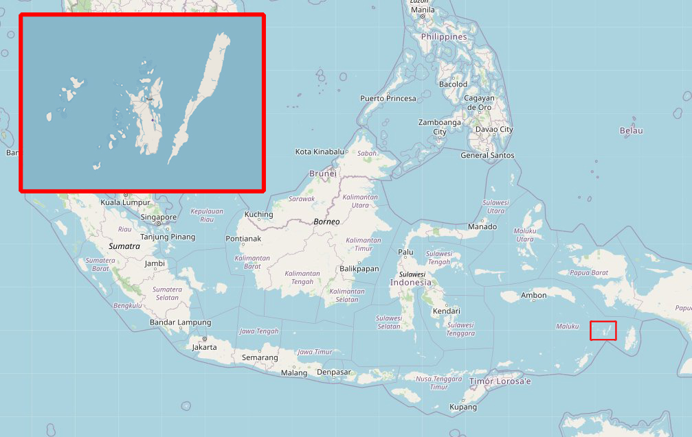 Afbeelding: Inzet linksboven de Kei-eilanden en de ligging van deze archipel in het oosten van Indonesië (bron: openstreetmap.org)